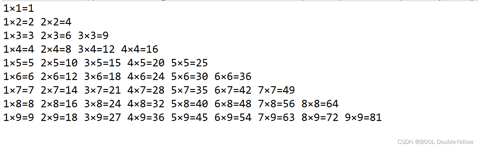 public static void main(String[] args) { //输出九九乘法表int a=1; //外层循环变量,控制行int b=1; //内层循环变量控制列for(a=1;a<10;a++) //外层循环为a,内层循环执行a次,内层循环不满足跳出到外层循环{for(b=1;b<=a;b++){ //因为都是1开头逐次递增乘一个数所以"="号左边以b开头System.out.print(b+"×"+a+"="+a*b+" ");}System.out.println("");//打印完一行后换行,可以自己试一下} } (2)第二种方式