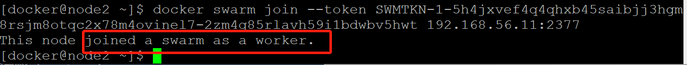 [docker@node2 ~]$ docker swarm join --token SWMTKN-1-5h4jxvef4q4qhxb45saibjj3hgm8rsjm8otqc2x78m4ovinel7-2zm4q85rlavh59i1bdwbv5hwt 192.168.56.11:2377 正常情况下如下会提示作为worker节点加入成功。
