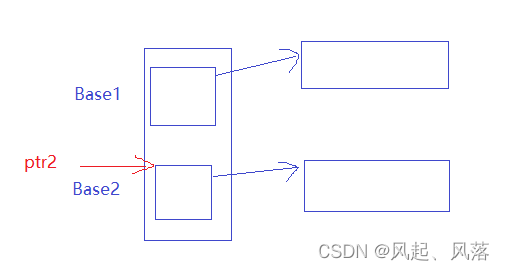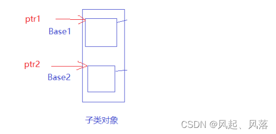 ptr1->func1 调用的是子类的func1函数,ptr1指向调用对象的开始ptr2并没有指向子类对象的开始,此时调用子类对象的func1函数,this指针指向中间的位置不对了,所以需要修正this指针,使之指向子类对象开始的地方