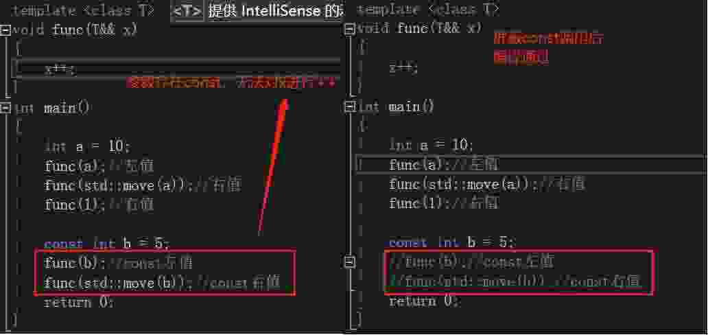 int main(){ // 右值引用只能右值,不能引用左值。 int&& r1 = 10; // error C2440: “初始化”: 无法从“int”转换为“int &&” // message : 无法将左值绑定到右值引用 int a = 10; int&& r2 = a; // 右值引用可以引用move以后的左值 int&& r3 = std::move(a); return 0;}
