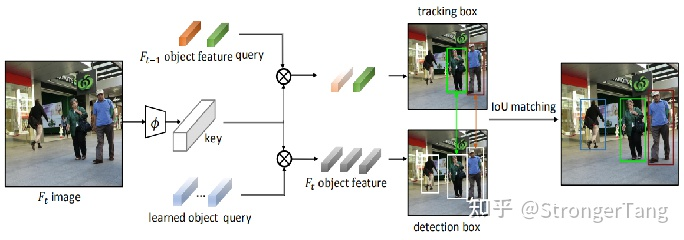 TransTrack将当前帧的特征图作为Key,将前一帧的目标特征Query和一组从当前帧学习到的目标特征Query一起作为整个网络的输入Query。