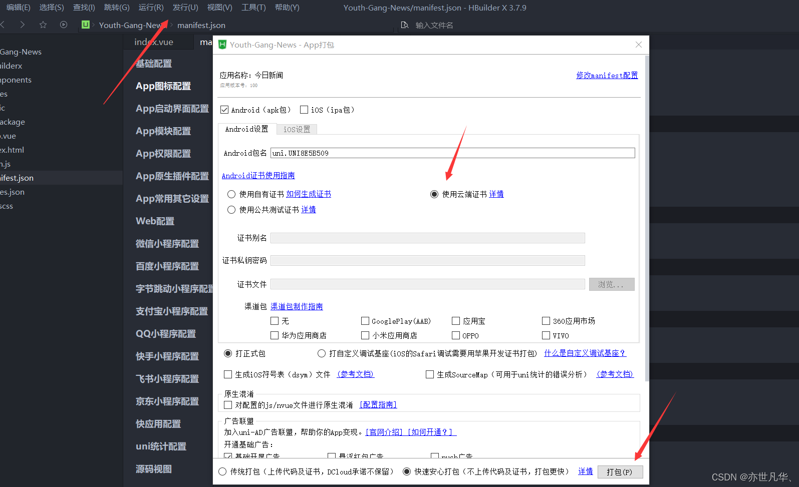 点击编辑器发行的第一个,原生App云打包,选择云端证书直接打包即可。