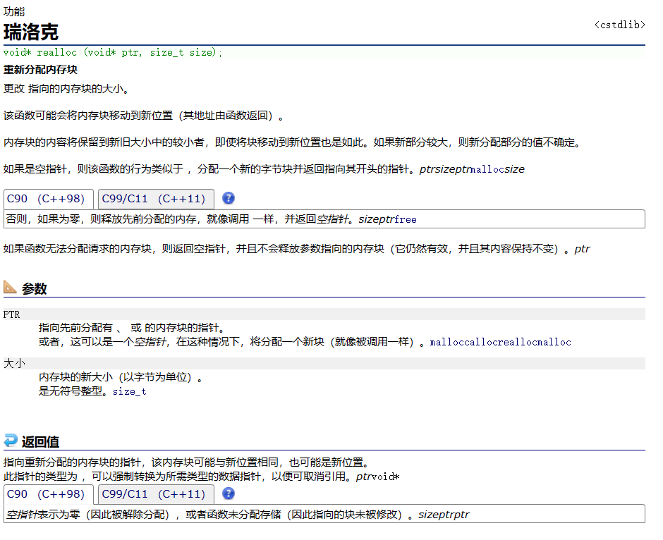 void* realloc (void*ptr, size_t size); ptr 是要调整的内存地址size 调整之后新大小返回值为调整之后的内存起始位置。这个函数调整原内存空间大小的基础上,还会将原来内存中的数据移动到 新 的空间。 由于内存空间是随机分配的,当我们想要扩大原来开辟的空间时,后面的内存可能已经被占用了