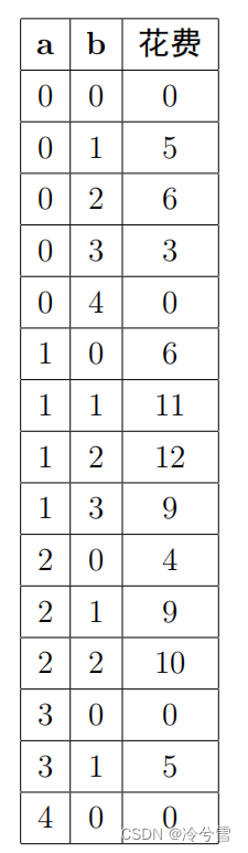 样例中有 4 个人, 2 个娱乐项目,我们用一个二元组 ( a , b ) 表示 a 个人选 择了第一个娱乐项目,b 个人选择了第二个娱乐项目,那么就有 4 − a − b 个 人没有选择任何项目,方案 ( a , b ) 对应的门票花费为 max ( − 4 × a + 10 , 0) × a + max ( − 2 × b + 7 , 0) × b ,所有的可能如下所示: