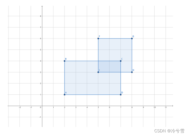 【问题描述】 平面上有个两个矩形 R 1 和 R 2 ,它们各边都与坐标轴平行。设 ( x 1 , y 1 ) 和 (x 2 , y 2 ) 依次是 R 1 的左下角和右上角坐标, ( x 3 , y 3 ) 和 ( x 4 , y 4 ) 依次是 R 2 的左下 角和右上角坐标,请你计算 R 1 和 R 2 的总面积是多少? 注意:如果 R 1 和 R 2 有重叠区域,重叠区域的面积只计算一次。 【输入格式】 输入只有一行,包含 8 个整数,依次是: x 1 , y 1 , x 2 , y 2 , x 3 , y 3 , x 4 和 y 4 。 【输出格式】 一个整数,代表答案。 【样例输入】2 1 7 4 5 3 8 6 【样例输出】 22 【样例说明】 样例中的两个矩形如图所示: