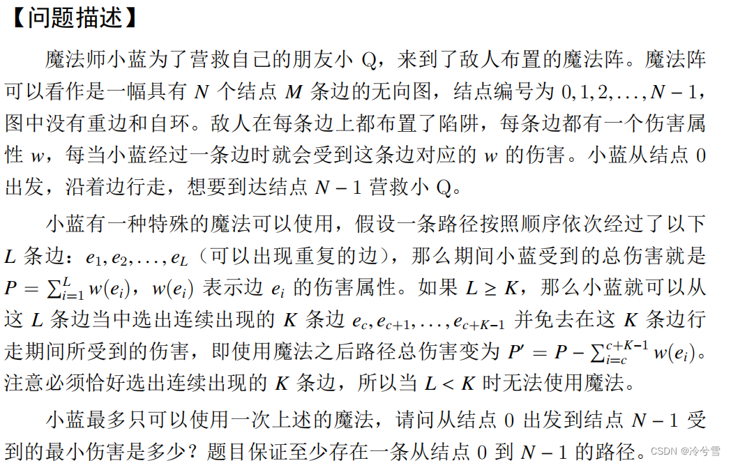 0 【样例说明】 样例 1 ,存在路径: 0 → 1 → 2 → 3 , K = 2 ,如果在 0 → 1 → 2 上使用魔 法,那么答案就是 0 + 0 + 4 = 4 ;如果在 1 → 2 → 3 上使用魔法,那么答案就 是 2 + 0 + 0 = 2 。再也找不到比 2 还小的答案了,所以答案就是 2 。 样例 2 ,存在路径: 0 → 1 → 0 → 1 → 0 → 1 , K = 5 ,这条路径总计恰好 走了 5 条边,所以正好可以用魔法消除所有伤害,答案是 0 。 【评测用例规模与约定】 对于 30 % 的评测用例, 1 ≤ N ≤ 20 。 对于 50 % 的评测用例, 1 ≤ N ≤ 100 。 对于 100 % 的评测用例, 1 ≤ N ≤ 1000 , 1 ≤ M ≤ N × ( N−1) /2 ,1 ≤ K ≤ 10 , 0 ≤ u , v ≤ N − 1 , 1 ≤ w ≤ 1000 。