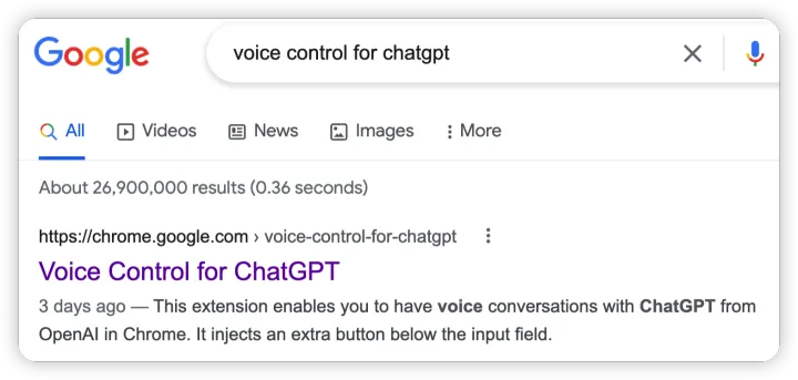 首先,谷歌搜索voice control for chatgpt,点击第一个chrome…的链接即可。