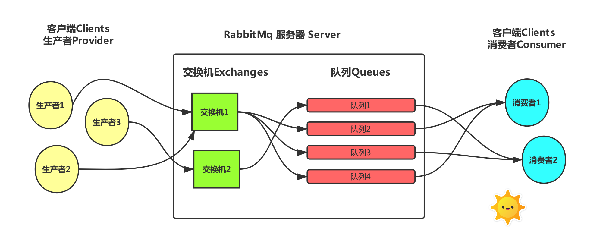生产者产生消息,将消息推送到中间方框里面也就是rabbitMq的服务器,然后经过服务器里面的交换机、队列等各种关系将数据处理入列后,最终由右边的消费者获取对应监听的消息进行消耗处理。