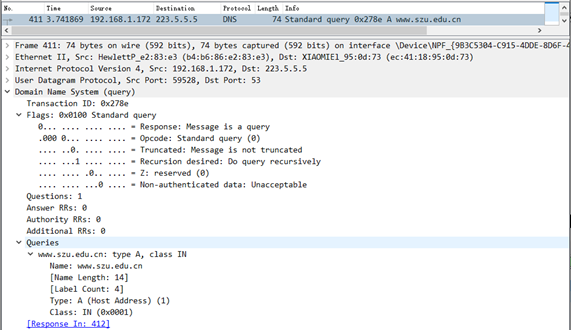 首先打开请求的数据包,如图 12所示。从结果看出,协议采用UDP,端口为53;请求向223.5.5.5(阿里云公共DNS)发出;该数据包的Transaction ID为0x6cea。又从Flags字段中可以得出是一个请求的数据包,请求的是标准的查询,没有被截断,请求递归查询。接着从Queries字段中得出请求的只有一个域名的解析,类型为ipv4,为网络数据类。