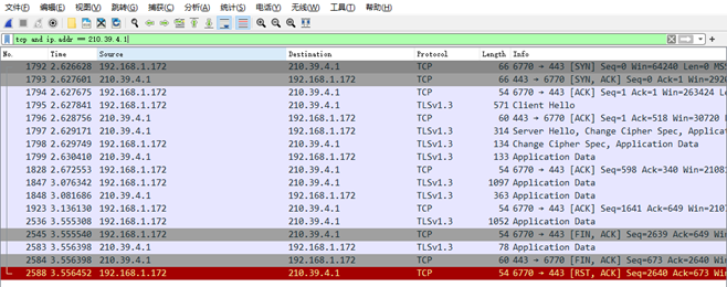 接下来通过打开网站www.szu.edu.cn来观察TCP连接的情况。首先打开Wireshark对网卡进行数据包捕捉,然后在浏览器中打开www.suz.edu.cn。由图 7可得,域名解析后的ip地址为210.39.4.1,于是在Wireshark的筛选框中输入“ip.addr == 210.39.4.1”来筛选数据包。得到结果如图 22所示。