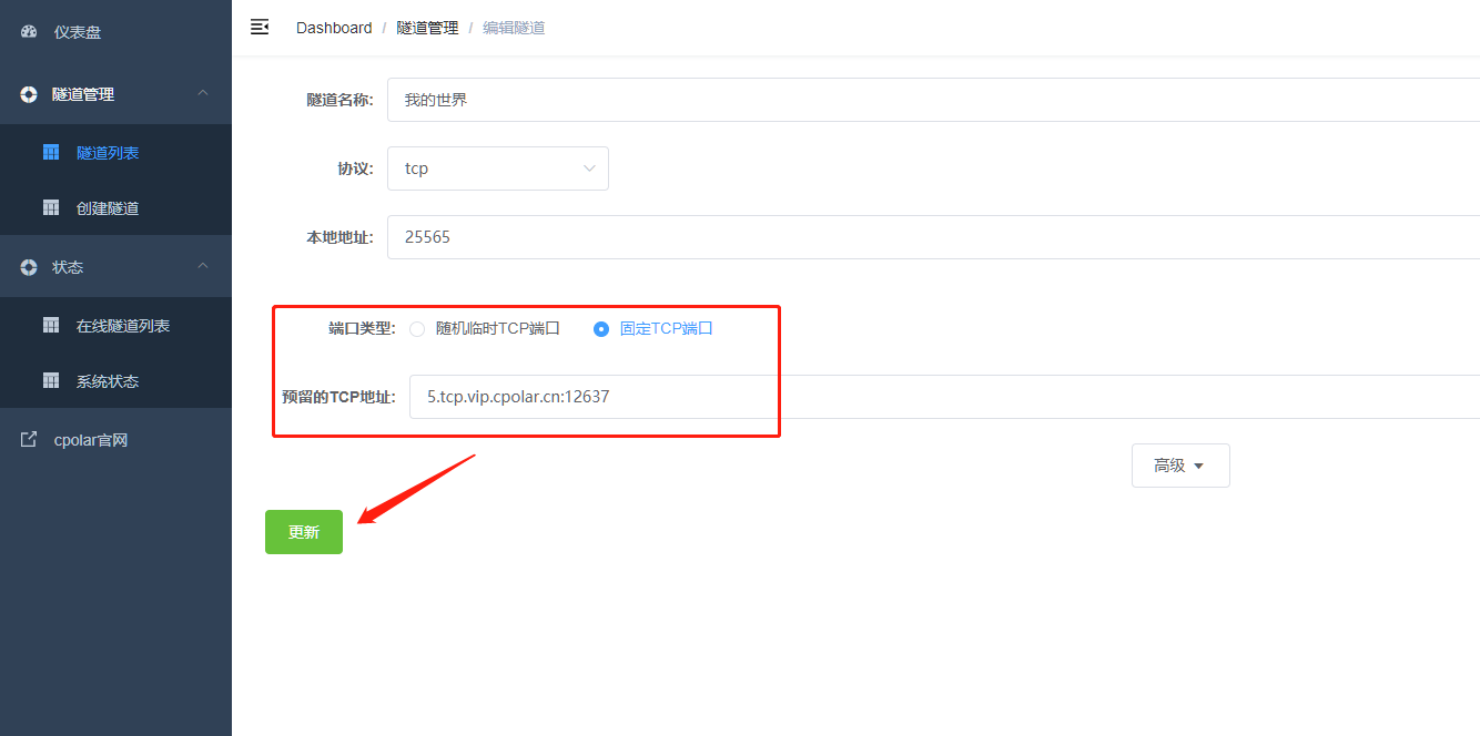 端口类型:修改为固定tcp端口预留的tcp地址:填写保留成功的地址,本例为5.tcp.vip.cpolar.cn:12637 点击更新
