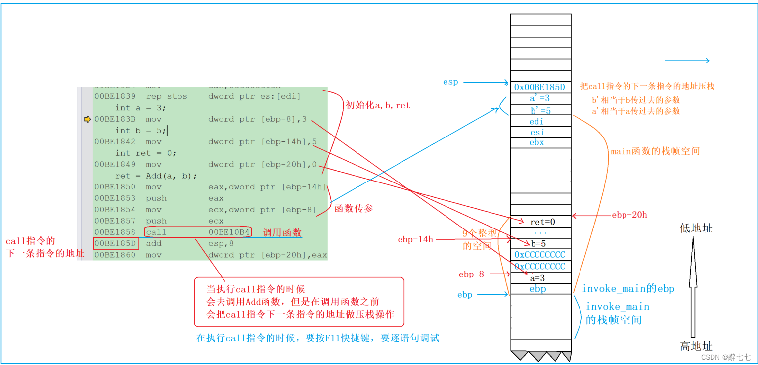 int a = 3;00BE183B mov dword ptr [ebp-8],3 //将3存储到ebp-8的地址处,ebp-8的位置其实就是a变量 int b = 5;00BE1842 mov dword ptr [ebp-14h],5 //将5存储到ebp-14h的地址处,ebp-14h的位置其实是b变量 int ret = 0;00BE1849 mov dword ptr [ebp-20h],0 //将0存储到ebp-20h的地址处,ebp-20h的位置其实是ret变量//以上汇编代码表示的变量a,b,ret的创建和初始化,这就是局部的变量的创建和初始化//其实是局部变量的创建时在局部变量所在函数的栈帧空间中创建的//调用Add函数 ret = Add(a, b);//调用Add函数时的传参//其实传参就是把参数push到栈帧空间中00BE1850 mov eax,dword ptr [ebp-14h] //传递b,将ebp-14h处放的5放在eax寄存器中 00BE1853 push eax //将eax的值压栈,esp-400BE1854 mov ecx,dword ptr [ebp-8] //传递a,将ebp-8处放的3放在ecx寄存器中00BE1857 push ecx //将ecx的值压栈,esp-4//跳转调用函数00BE1858 call 00BE10B400BE185D add esp,800BE1860 mov dword ptr [ebp-20h],eax