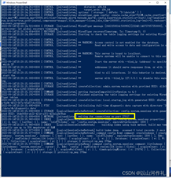 D:\Mongodb\bin\mongod --dbpath D:\data\db 如果执行成功,会输出如下信息: