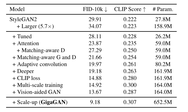 GANs能否继续扩大规模,并可能从这些复杂资源中受益,还是已经停滞不前?是什么阻止了它们进一步扩大,我们能克服这些障碍吗?在这些问题的基础上,作者首先研究分析了StyleGAN的关键问题,其次重新引入了多尺度训练,找到了一种改进图像-文本对齐和生成输出的低频细节的新方案——GigaGAN,与扩散和自回归模型相比,GigaGAN有三个主要的实际优势: