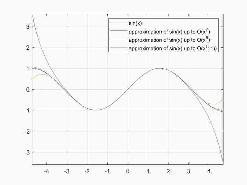 syms x;y=sin(x);y1=taylor(sin(x),x,'Order',8);y2=taylor(sin(x),x,'Order',10);y3=taylor(sin(x),x,'Order',12);fplot([y y1 y2 y3])xlim([-3/2*pi 3/2*pi])grid onlegend('sin(x)','approximation of sin(x) up to O(x^7)','approximation of sin(x) up to O(x^9)','approximation of sin(x) up to O(x^(11))')