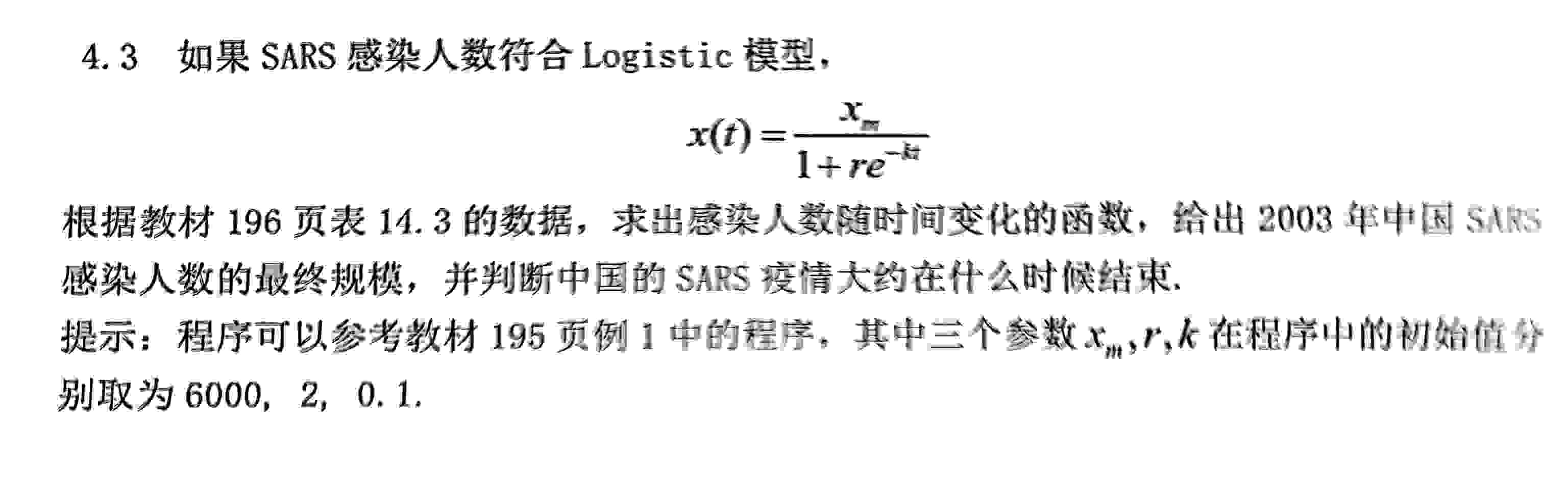 x=1:26;y=[1807,2001,2158,2305,2422,2601,2753,2914,3106,3303,3460,3638,3799,3971,4125,4280,4409,4560,4698,4805,4884,4948,5013,5086,5124,5163];a=[2,0.1,0.1];%r、k、af=@(a,x)a(1)*exp(a(2)*x+a(3));[A,resnorm]=lsqcurvefit(f,a,x,y) t=27;while f(A,t+1)-f(A,t)>=10 t=t+1;endf(A,t)A = 2.4511 0.3152 -0.0841resnorm = 2.3628e+08ans = Inf