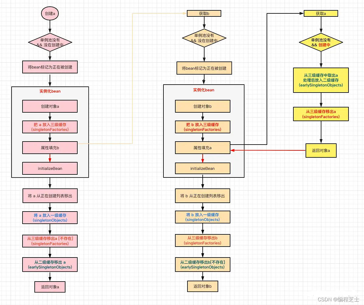 实例化A -> a的半成品写入缓存 -> 属性注入B -> B还没有实例化,需要先进行实例化B -> 实例化B -> 没有A,但是有A的半成品 -> 注入A的半成品 -> 实例化B成功 -> 实例化A成功