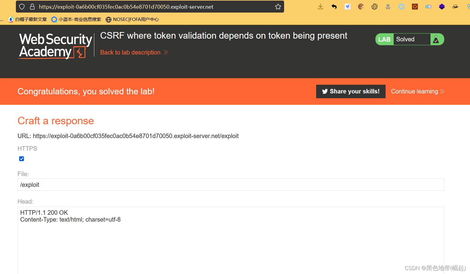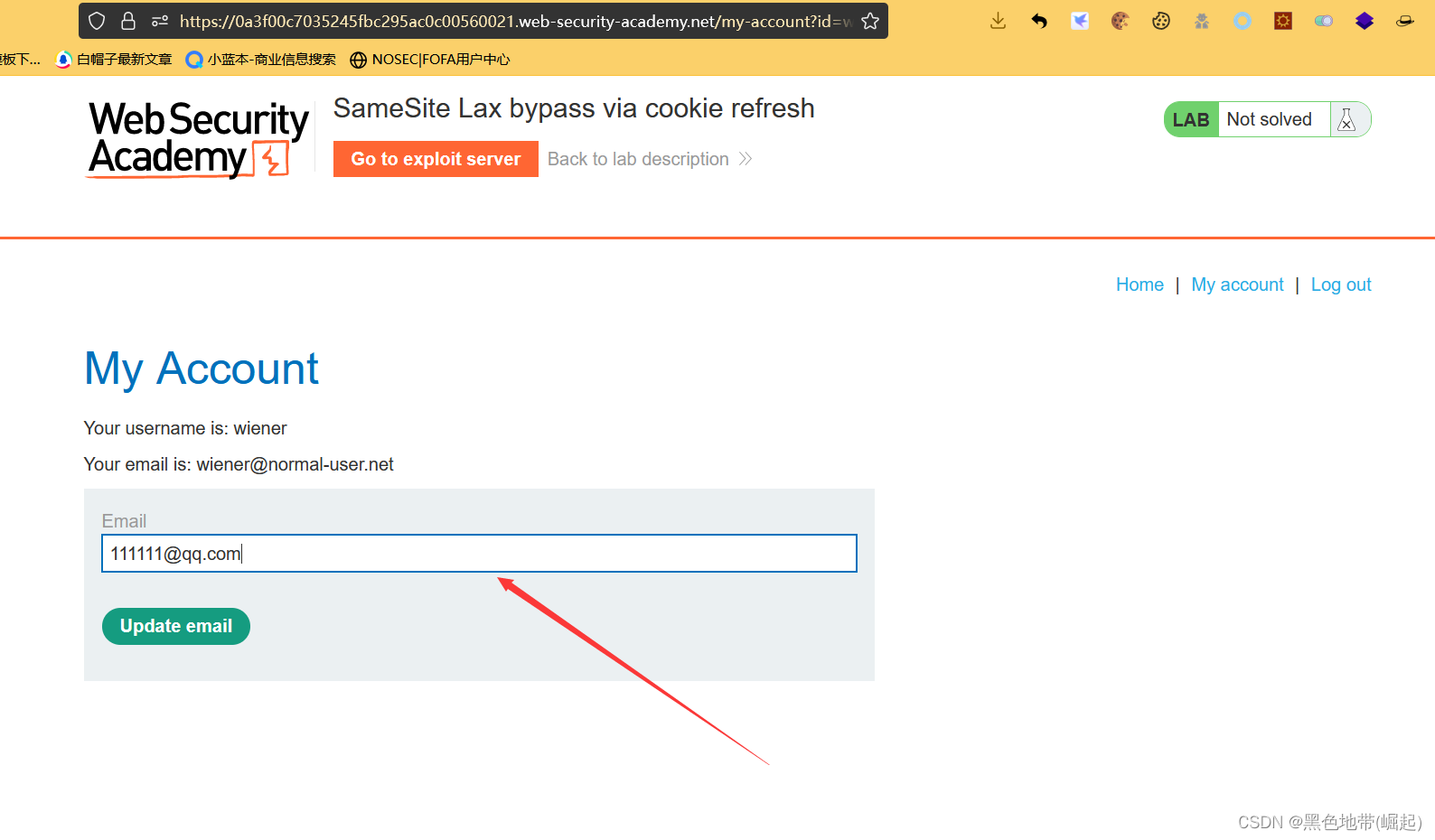 解决实验:使用漏洞攻击服务器托管一个HTML页面,该页面使用CSRF攻击来更改查看者的电子邮件地址