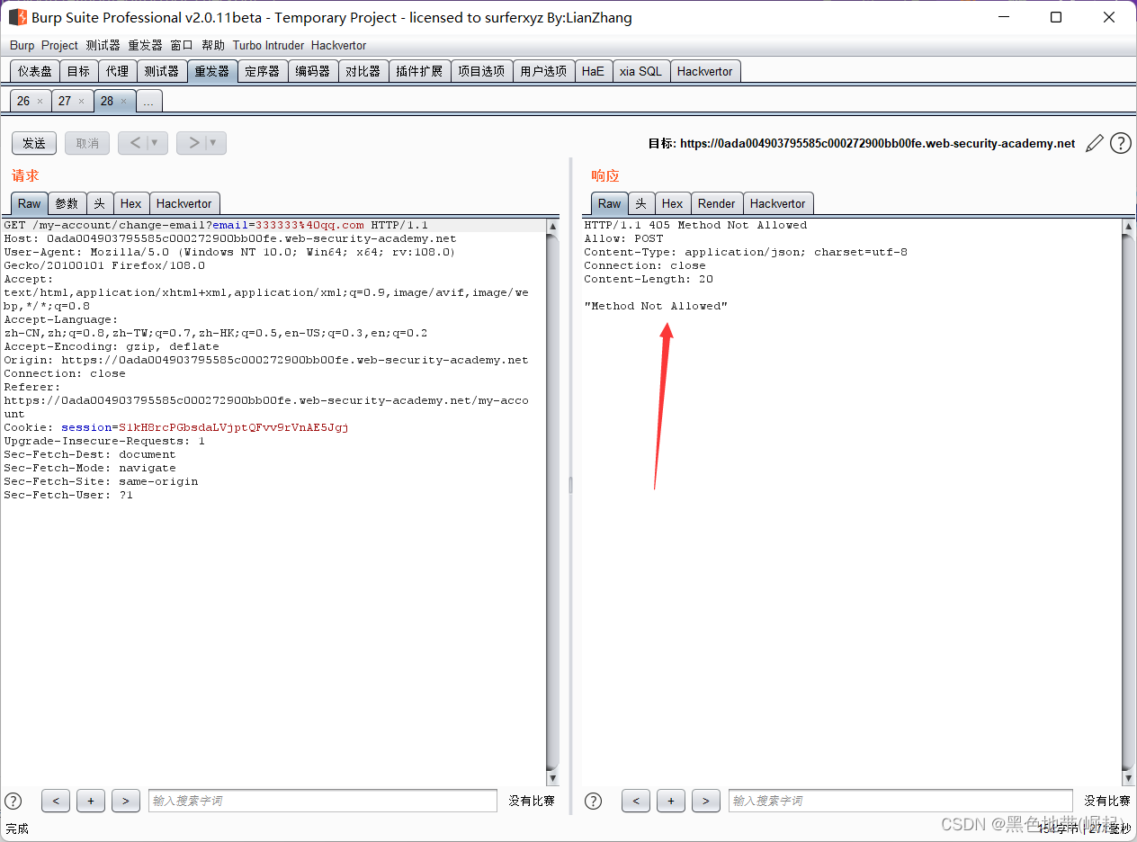 HTTP历史记录选项卡,找到POST /my-account/change-email请求,并确认会话cookie是否包含在内,即使这是一个跨站点POST请求