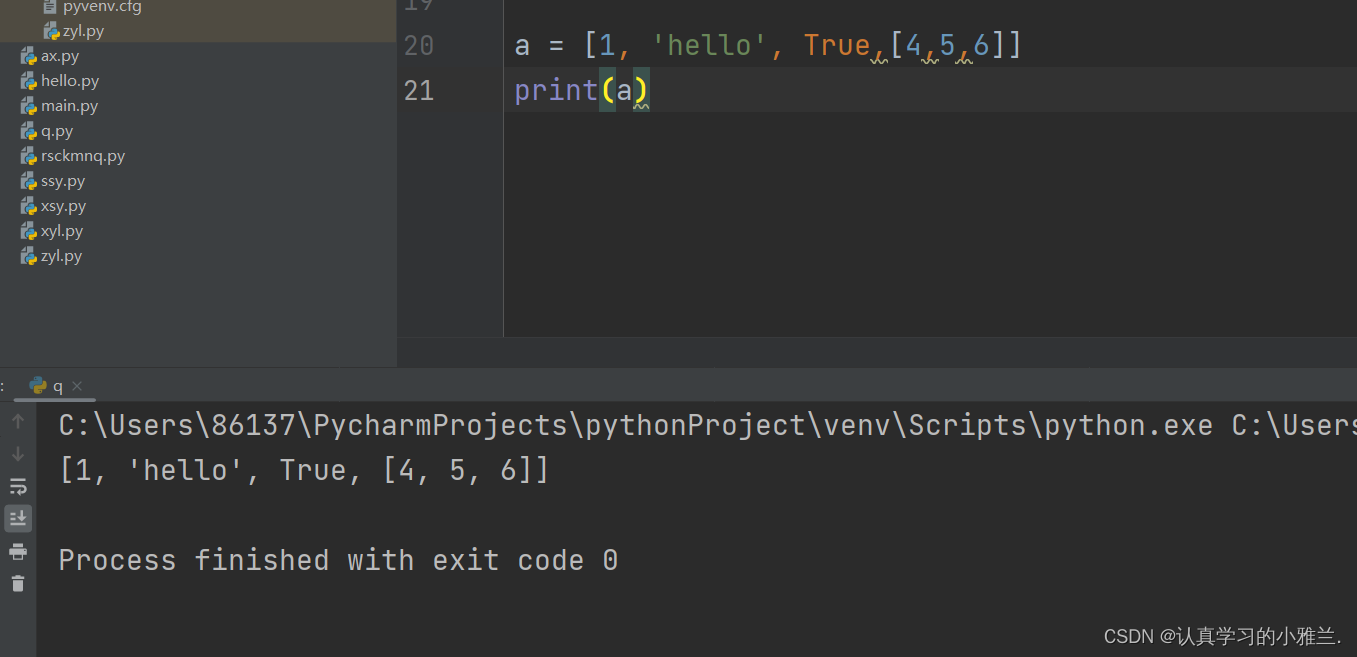 a = [1, 'hello', True,[4,5,6]]print(a) 因为 list 本身是 Python 中的内建函数, 不宜再使用 list 作为变量名。