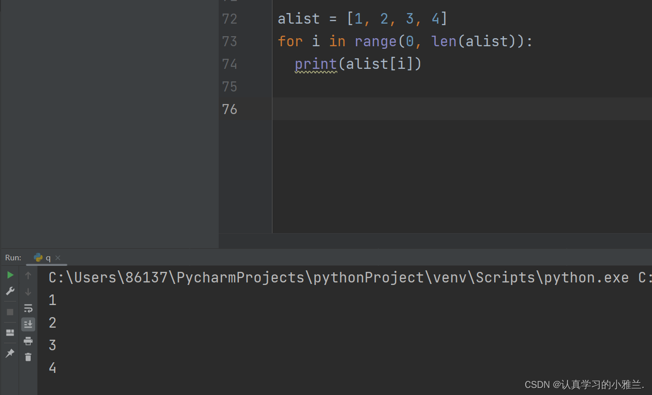 alist = [1, 2, 3, 4]for i in range(0, len(alist)): print(alist[i])