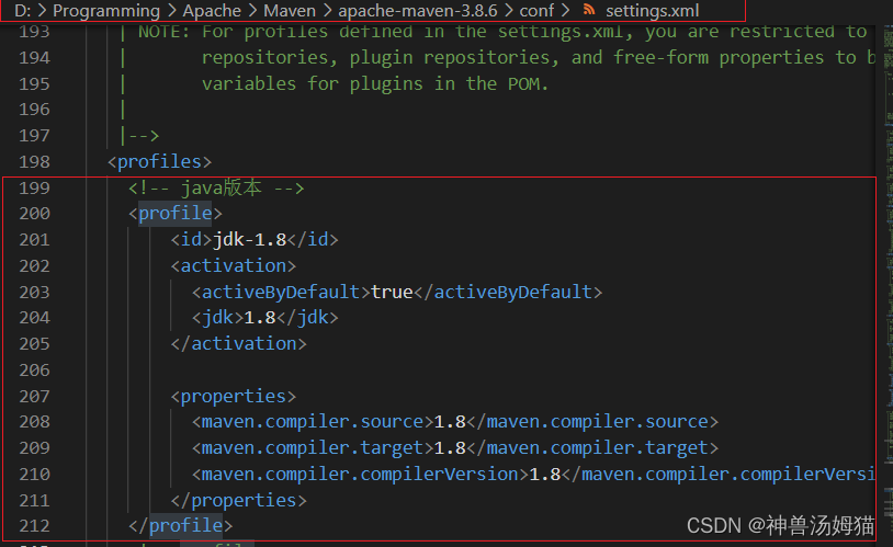 打开conf文件夹下的settings.xml文件找到profiles节点,添加如下配置(根据自己的Java版本设置,我的是1.8):