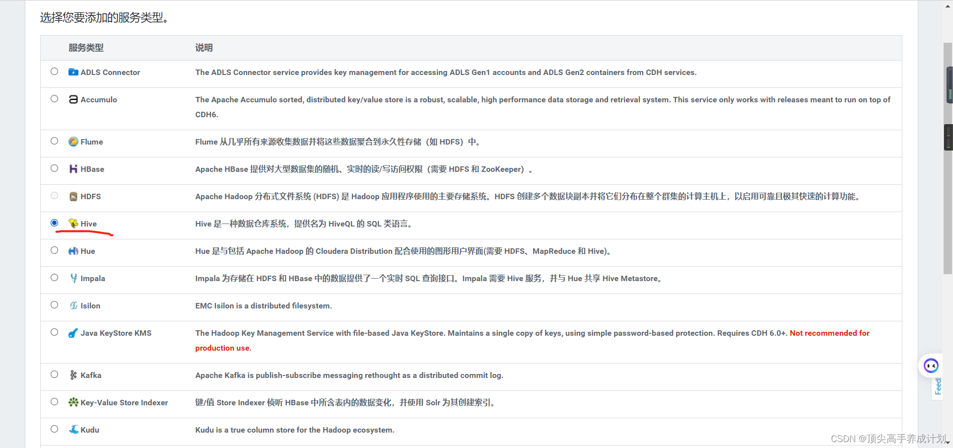 #########################密码认证######################### 1)使用kinit进行主体认证kinit admin/admin# 2)查看认证凭证klist [root@hadoop101 bin]# klistTicket cache: FILE:/tmp/krb5cc_0Default principal: admin/admin@HADOOP.COMValid starting Expires Service principal05/02/2023 14:32:48 05/03/2023 14:32:48 krbtgt/HADOOP.COM@HADOOP.COMrenew until 05/09/2023 14:32:48# 3)销毁认证凭证kdestroy[root@hadoop101 bin]# kdestroy[root@hadoop101 bin]# klistklist: No credentials cache found (filename: /tmp/krb5cc_0)#################秘钥认证################################# 由于认证过程中都需要输入密码。所以我们需要为user用户生成keytab文件,便于后续免密登录,不指定路径的话默认放在当前工作目录,我们指定到“/etc/ security/”下。# 注意:在生成keytab文件时需要加参数”-norandkey”,否则CDH平台的kerberos密码会重置,会导致直接使用kinit admin/admin初始化时会提示密码错误。# kadmin.local -q "xst -k /root/admin.keytab admin/admin@HADOOP.COM" #这种会对于密码进行修改kadmin.local -q "xst -norandkey -k /root/admin.keytab admin/admin@HADOOP.COM"kinit -kt /root/admin.keytab admin/adminklist[root@hadoop101 bin]# klistTicket cache: FILE:/tmp/krb5cc_0Default principal: admin/admin@HADOOP.COMValid starting Expires Service principal05/02/2023 14:37:51 05/03/2023 14:37:51 krbtgt/HADOOP.COM@HADOOP.COMrenew until 05/09/2023 14:37:51 kdestroy CDH启用Kerberos安全认证