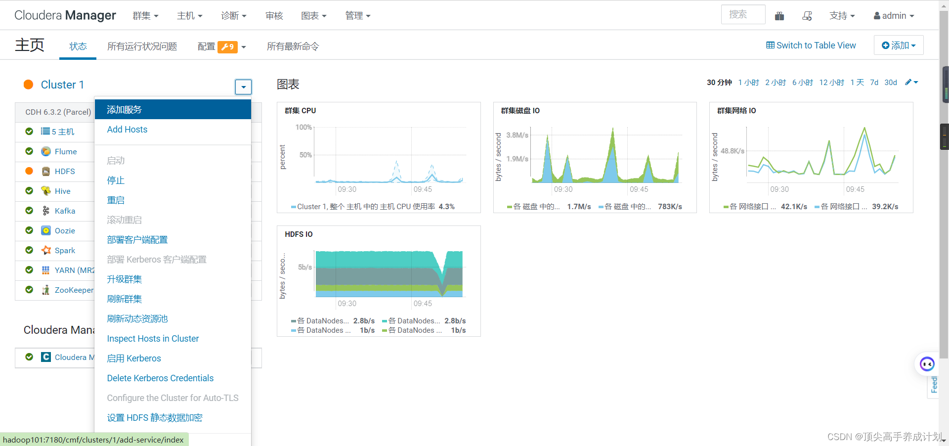 cd /opt/cloudera/parcel-reposz manifest.json#然后在下载上面生成的manifest.json# 在hadoop102执行scp FLINK-1.13.6-CDH6.3.2-el7.parcel* hadoop101:/opt/cloudera/parcel-repo# 在hadoop101上面的包如下-rw-r--r-- 1 root root 2082186246 May 1 17:26 CDH-6.3.2-1.cdh6.3.2.p0.1605554-el7.parcel-rw-r--r-- 1 root root 40 May 1 17:20 CDH-6.3.2-1.cdh6.3.2.p0.1605554-el7.parcel.sha-rw-r----- 1 cloudera-scm cloudera-scm 79610 May 2 00:09 CDH-6.3.2-1.cdh6.3.2.p0.1605554-el7.parcel.torrent-rw-r--r-- 1 root root 395609370 May 2 12:43 FLINK-1.13.6-CDH6.3.2-el7.parcel-rw-r--r-- 1 root root 40 May 2 12:43 FLINK-1.13.6-CDH6.3.2-el7.parcel.sha-rw-r--r-- 1 root root 33892 May 1 17:19 manifest.jsonsz manifest.json#拷贝FLINK_ON_YARNcd /opt/module/flink-parcelscp FLINK_ON_YARN-1.13.6.jar hadoop101:/opt/cloudera/csd/ [root@hadoop101 csd]# lsFLINK_ON_YARN-1.13.6.jar#重启服务systemctl restart cloudera-scm-server#查看启动日志tail -f /var/log/cloudera-scm-server/cloudera-scm-server.log 把hadoop102生成的manfest.json放在hadoop101的 manfest.json最下面就行