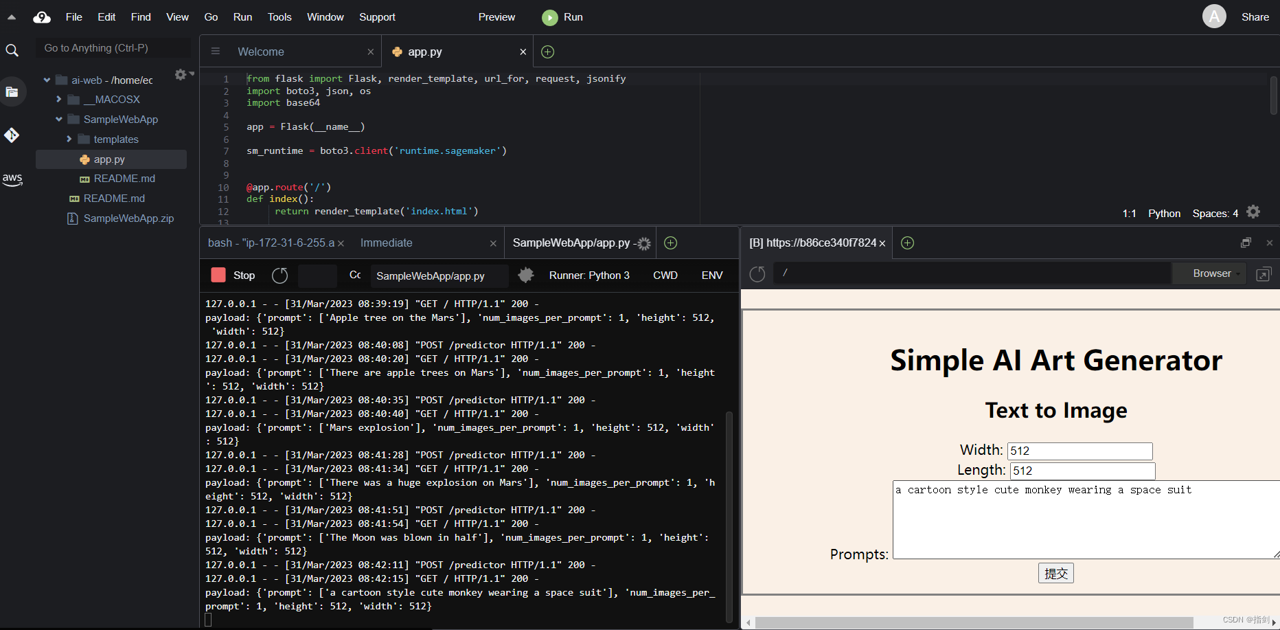 wget https://static.us-east-1.prod.workshops.aws/public/73ea3a9f-37c8-4d01-ae4e-07cf6313adac/static/code/SampleWebApp.zipunzip SampleWebApp.zippip install Flask boto3 等待Web应用运行起来后,开始使用描述词来生成我们的图片