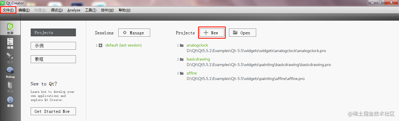 创建项目有两个入口,一个是在欢迎页面的projects中点击New(新建)按钮,另一个是点击标题栏中的文件,在文件下拉列表中点击新建文件或项目。