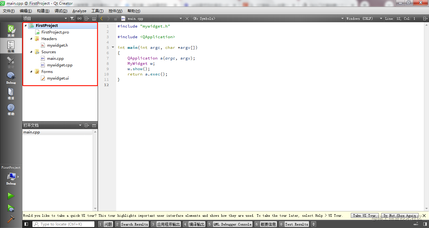 我们在左上项目窗口可以看到我们创建的项目包含了哪些文件,首先有一个.pro文件,接下来是头文件,然后是源文件,最后是ui文件。其中MyWidget.h和MyWidget.cpp以及MyWidget.ui使我们在创建项目过程中自己设置的主窗口的相关文件。而FirstProject.pro文件和main.cpp文件是自动创建出来的文件。那么FirstProject.pro文件和main.cpp文件又是做什么的呢?