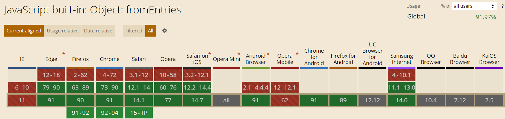 const arr = [["name", "O.O"], ["address", "xxx"]]console.log((Object.fromEntries(arr)) // {name: "O.O", address: "xxx"} const user = { name: 'O.O', age: 18, address: 'xxx'}Object.fromEntries(Object.entries(user).filter(([key, value]) => key !== 'age'))// {name: "O.O", address: "xxx"} 浏览器支持情况