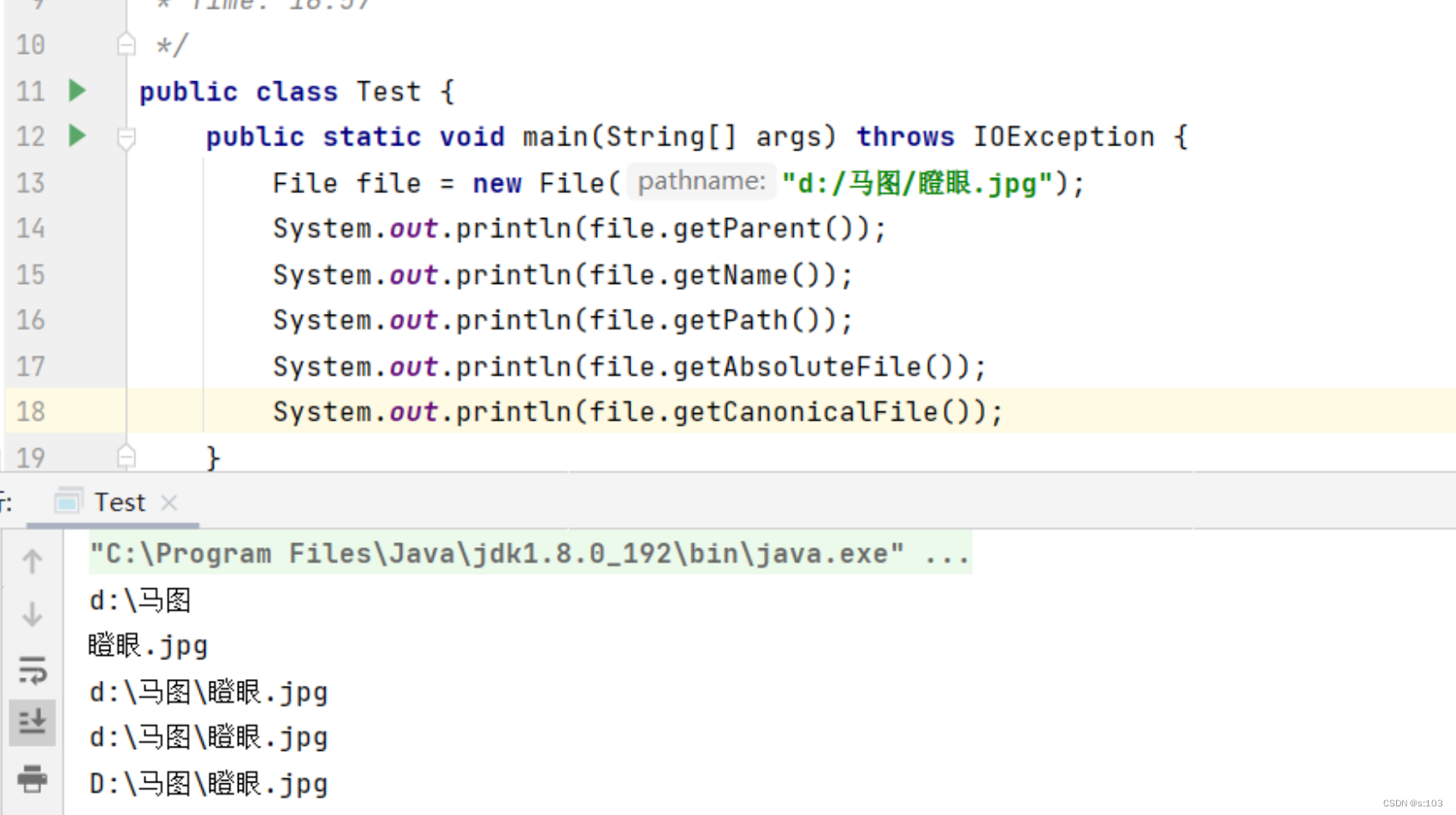 绝对路径public static void main(String[] args) throws IOException { File file = new File("d:/马图/瞪眼.jpg"); System.out.println(file.getParent()); System.out.println(file.getName()); System.out.println(file.getPath()); System.out.println(file.getAbsoluteFile()); System.out.println(file.getCanonicalFile());} IOException是IO操作的会抛出的常见异常 是首查异常,也叫编译时异常