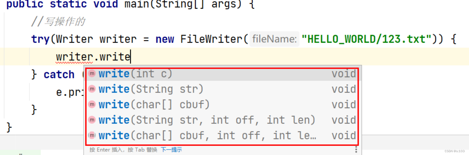 public static void main(String[] args) { try(Writer writer = new FileWriter("HELLO_WORLD/123.txt")) { writer.write('0'); writer.write(new char[]{'1', '2', '3', '4', '5', '6'}); writer.write("789"); writer.flush(); } catch (IOException e) { e.printStackTrace(); } } 写操作跟字节流一样,无此文件,自动创建~