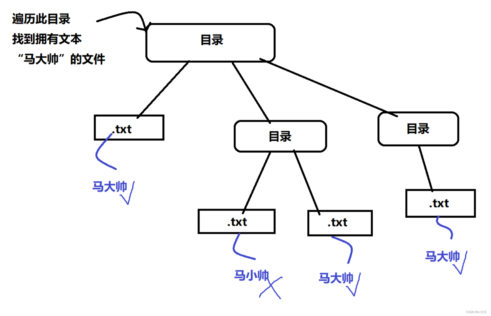 n叉树就得写循环来递归了如果是扫描到二进制文件,我们也不指望里面有我们要的文本,因为二进制一般存放一些后端数据信息,并不是给人看的,不是观赏性的,但是二进制文件还是可能会读到的~记得设立递归出口,死递归会导致栈溢出public static void scan(File file, String words) throws IOException { File[] files = file.listFiles(); if(files == null) { // 这里空目录对应的并不是空数组!是null~ return; }else { for (int i = 0; i < files.length; i++) { File f = files[i]; if(f.isFile()) { String content = readAll(f); if(content.contains(words)) { System.out.println(f.getCanonicalFile()); } } if(f.isDirectory()) { scan(f, words); } //两种都不是的其他文件,就不能读~ } }}