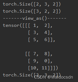 data1 = [[[1, 2], [3, 4], [5, 6]], [[7, 8], [9, 0], [10, 11]]]t1 = torch.Tensor(data1).long() # size=2,3,2data2 = [[[1, 2], [3, 4]], [[5, 6], [7, 8]], [[9, 0], [10, 11]]]t2 = torch.Tensor(data2).long()print(t1.size())print(t2.size())print("-------view_as()-------")t2=t2.view_as(t1)print(t2)print(t2.size()) 输出结果: