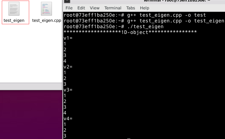# 建立 test 测试文件touch test_eigen.cpp# 用gedit打开此测试文件,添加C++代码用于测试gedit test_eigen.cpp# 编译后生成一个test_eigen的可执行文件g++ test_eigen.cpp -o test_eigen# 在test_eigen可执行文件目录下执行以下命令,证明eigen库安装完成./test_eigen 在test_eigen.cpp文件中添加的C++测试代码。