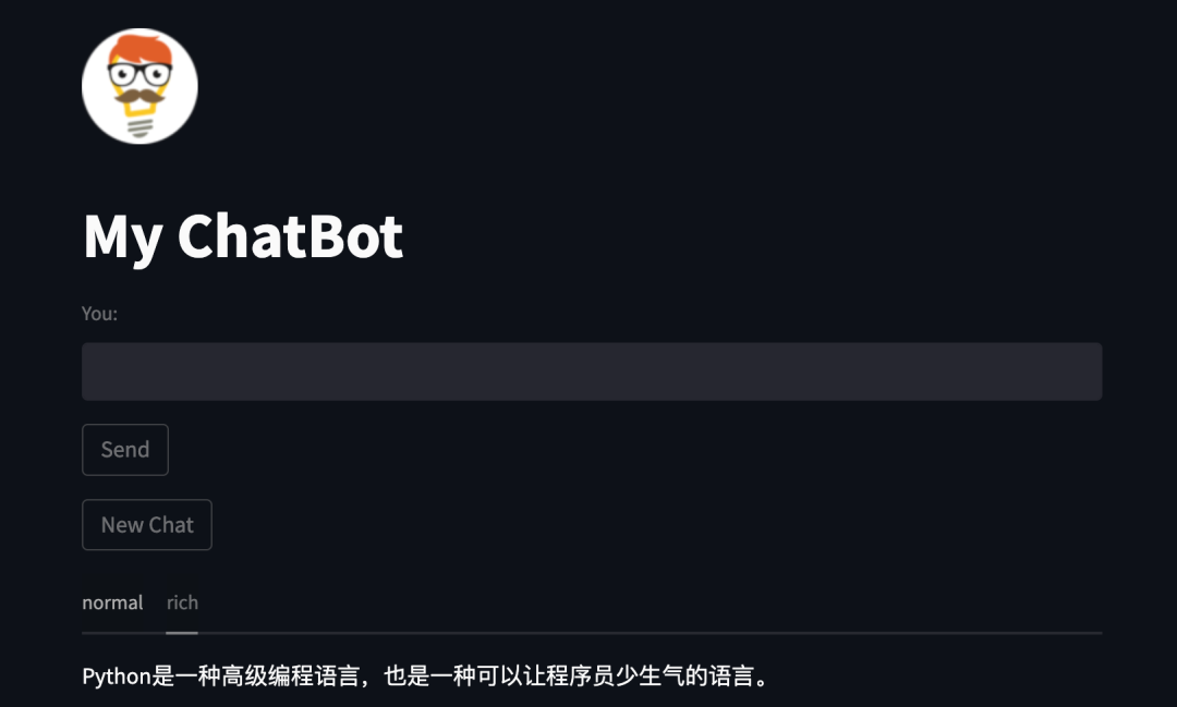 import openaiimport streamlit as stfrom streamlit_chat import message# 填写 API keyopenai.api_key = '{Your API key}'# 如果没有 prompts 这个 session_state,就初始化if 'prompts' not in st.session_state: st.session_state['prompts'] = [{"role": "system", "content": "You are a helpful assistant. Answer as concisely as possible with a little humor expression."}]# 如果没有 generated 这个 session_state,就初始化if 'generated' not in st.session_state: st.session_state['generated'] = []# 如果没有 past 这个 session_state,就初始化if 'past' not in st.session_state: st.session_state['past'] = []# 生成 ChatGPT API 的回答def generate_response(prompt): # 把用户输入的消息加入到 prompts 中 st.session_state['prompts'].append({"role": "user", "content":prompt}) # 调用 ChatGPT API completion=openai.ChatCompletion.create( model="gpt-3.5-turbo", messages = st.session_state['prompts'] ) # 从 API 返回的结果中获取 ChatBot 的回答 message=completion.choices[0].message.content return message# 重置聊天界面def end_click(): st.session_state['prompts'] = [{"role": "system", "content": "You are a helpful assistant. Answer as concisely as possible with a little humor expression."}] st.session_state['past'] = [] st.session_state['generated'] = [] st.session_state['user'] = ""# 处理聊天按钮点击事件def chat_click(): if st.session_state['user']!= '': # 获取用户输入的消息 chat_input = st.session_state['user'] # 调用 ChatGPT API 生成回答 output=generate_response(chat_input) # 把生成的回答和用户输入的消息存储到 session_state 中 st.session_state['past'].append(chat_input) st.session_state['generated'].append(output) st.session_state['prompts'].append({"role": "assistant", "content": output}) st.session_state['user'] = ""# 显示 ChatBot 界面st.image("logo.png", width=80)st.title("My ChatBot")# 显示用户输入框user_input=st.text_input("You:", key="user")# 显示聊天和重置按钮chat_button=st.button("Send", on_click=chat_click)end_button=st.button("New Chat", on_click=end_click)# 显示 ChatBot 的回答和用户的输入if st.session_state['generated']: # 倒序遍历已经生成的回答和用户的输入 for i in range(len(st.session_state['generated'])-1, -1, -1): # 分别使用两种方式显示 ChatBot 的回答 tab1, tab2 = st.tabs(["normal", "rich"]) with tab1: message(st.session_state['generated'][i], key=str(i) + '_generated') with tab2: st.markdown(st.session_state['generated'][i]) # 显示用户的输入 message(st.session_state['past'][i], is_user=True, key=str(i) + '_past') 执行streamlit命令后,你的聊天机器人网站将默认上线于http://{你的IP地址}:8501!