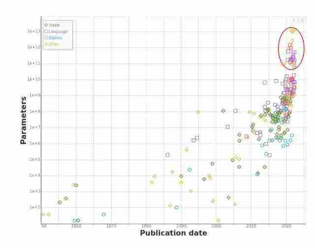 目前,为了提高LLM性能,人们将大部分精力放在了增加模型大小上面。2020年,OpenAI发表了一篇论文,提出了在增加模型尺寸与提高模型性能之间的扩展定律,论文的结论是:人们应该将大部分预算用于扩大模型规模。这篇论文直接推动了增大模型规模的浪潮。下图出自论文Machine Learning Model Sizes and the Parameter Gap,图中显示近年来语言模型大小呈显著增长趋势。