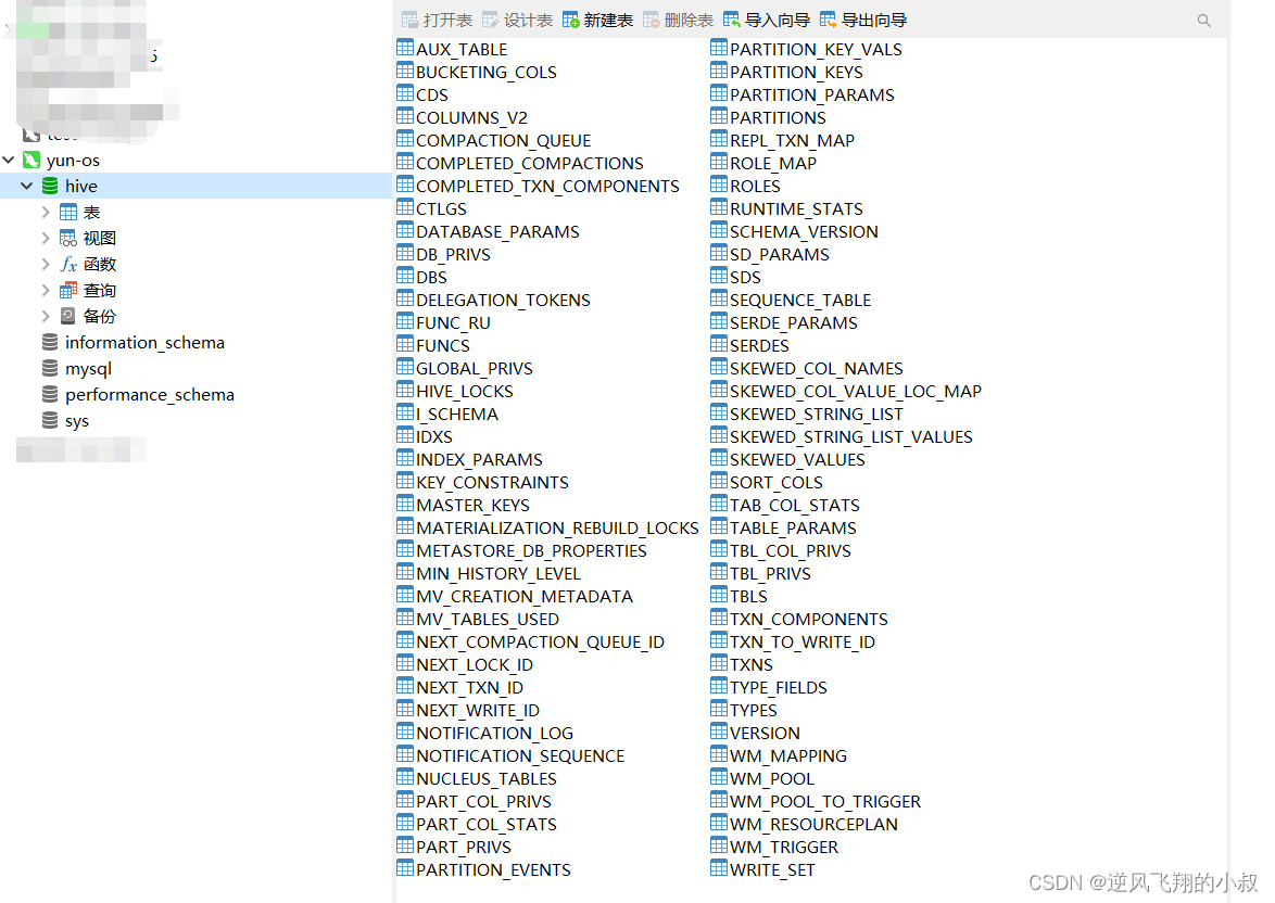 此时再通过navicat客户端工具查看,多出了一个hive的数据库以及下面的数据表;