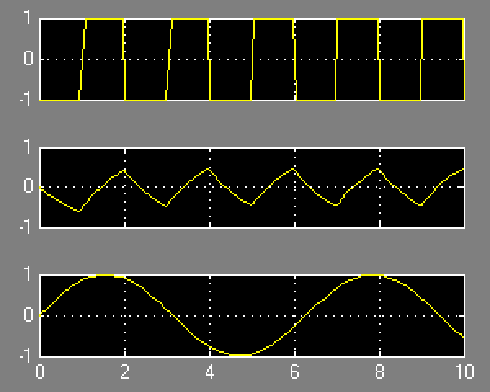 :积分环节。其输出为其输入信号的积分。 双击该模块,弹出积分器的参数对话框,可设置积分器的复位、积分上限和下限等。当设置为信号下跳过零复位、积分器限幅为±5时,积分器对谐波输入的输出如图所示: