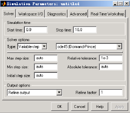 点击Simullink模型窗simulation菜单下的Parameters命令,弹出仿真参数对话框如右图所示。它共有5页,用得较多的主要是Solver页和Workspace I/O页。