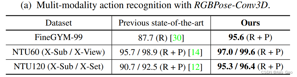我们还尝试用LateFusion将PoseConv3D的预测直接与其他模式融合。表9b显示,与Pose模态的后期融合可以将识别精度提高到一个新的水平。