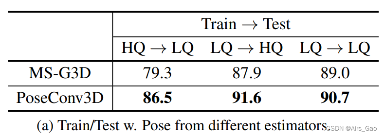 为了比较GCN和3D-CNN的泛化性,我们在FineGYM上设计了一个跨模型检验。具体来说,我们使用了两个模型,即HRNet (HigherQuality,简称HQ)和MobileNet (Lower-Quality,LQ)进行位姿估计,并在其上分别训练两个PoseConv3D。在测试过程中,我们将LQ输入到HQ 训练的模型中,反之亦然。从表5a中,我们可以看到,与GCN相比,在使用较低质量的姿势进行训练和测试时,使用PoseConv3D的准确性下降更小。