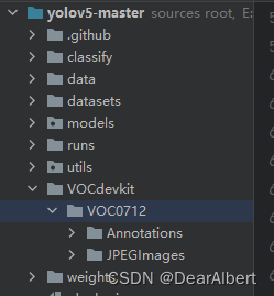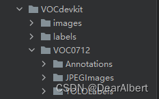 首先准备VOC07+12两个数据集,将两个数据集进行合并(直接将两个数据集的Annotations和JPEGImages两个文件夹中的内容进行合并即可),其中我们只需要Annotations标签文件夹,JPEGImages图片文件夹两个文件夹即可。VOC格式的数据集文件夹划分如下图所示。