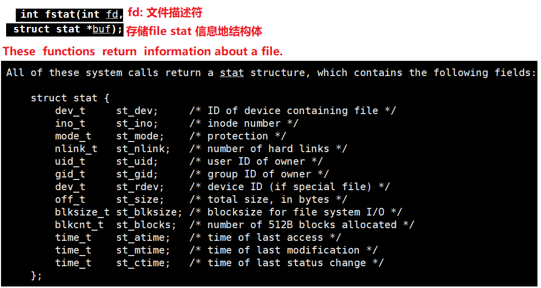#include <sys/types.h>#include <unistd.h>#include <stdio.h>#include <sys/stat.h>int main(int argc, char* argv[]) {if (argc != 2) {fprintf(stderr, "%s <filepath>", argv[0]);return -1;}int fd = open("./a.txt", O_RDONLY);struct stat st;int ret = fstat(fd, &st);printf("file size : %d\n", st.st_size);close(fd);return 0;} fcntl