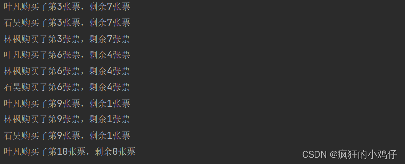public class MyThread { public static void main(String[] args) { Site site = new Site(); Thread t1 = new Thread(site,"林枫"); Thread t2= new Thread(site,"叶凡"); Thread t3 = new Thread(site,"石昊"); t1.start(); t2.start(); t3.start(); }}class Site implements Runnable{ //定义票的数量 int count = 10; //定义购买了第几张票 int sum = 0; @Override public void run() { while (true){ synchronized (this){ if (count==0) break; count--; sum++; try { Thread.sleep(100); } catch (InterruptedException e) { e.printStackTrace(); } System.out.println(Thread.currentThread().getName()+"购买了第"+sum+"张票,剩余"+count+"张票"); } } }} 运行结果: