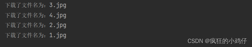 import org.apache.commons.io.FileUtils;import java.io.File;import java.io.IOException;import java.net.URL;//多线程同步下载图片public class TestThread extends Thread{ private String url; //网络图片地址 private String name;//保存的文件名 public TestThread(String url,String name){ this.url = url; this.name = name; } @Override public void run() { WebDownloader webDownloader = new WebDownloader(); webDownloader.downloader(url,name); System.out.println("下载了文件名为:"+name); } public static void main(String[] args) { TestThread testThread1 = new TestThread("https://dss2.bdstatic.com/5bVYsj_p_tVS5dKfpU_Y_D3/res/r/image/2022-10-16/toutiao1.png","1.jpg"); TestThread testThread2 = new TestThread("https://dss2.bdstatic.com/5bVYsj_p_tVS5dKfpU_Y_D3/res/r/image/2022-10-16/toutiao2.png","2.jpg"); TestThread testThread3 = new TestThread("https://dgss0.baidu.com/6ONWsjip0QIZ8tyhnq/it/u=1848053418,1608633216&fm=173&app=49&f=JPEG?w=312&h=208&s=A10BDE1442585DCE0642B4C2030050BA","3.jpg"); TestThread testThread4 = new TestThread("https://dgss1.baidu.com/6ONXsjip0QIZ8tyhnq/it/u=2303065390,19508065&fm=173&app=49&f=JPEG?w=312&h=208&s=E8720DD7568066E40838C97203008033","4.jpg"); testThread1.start(); testThread2.start(); testThread3.start(); testThread4.start(); }}//下载器class WebDownloader{ //下载方法 public void downloader(String url,String name){ try { FileUtils.copyURLToFile(new URL(url),new File(name)); } catch (IOException e) { e.printStackTrace(); System.out.println("IO异常,downloader方法出现问题!"); } }} 运行结果:输出下载好的文件名