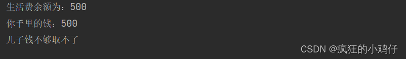 //不安全取钱//两个人去银行取钱,账户public class UnsafeBank { public static void main(String[] args) { //账户 Account account = new Account(1000,"生活费"); Drawing you = new Drawing(account,500,"你"); Drawing son = new Drawing(account,1000,"儿子"); you.start(); son.start(); }}//账户class Account{ int money; //余额 String name; public Account(int money, String name) { this.money = money; this.name = name; }}//银行:模拟取款class Drawing extends Thread{ Account account;//账户 int drawingMoney; //现在手里还有多少钱 int nowMoney; public Drawing(Account account,int drawingMoney,String name){ super(name); this.account=account; this.drawingMoney=drawingMoney; } //取钱 @Override public void run(){ //判断有没有钱 if (account.money-drawingMoney<0){ System.out.println(Thread.currentThread().getName()+"钱不够取不了"); return; } try {//sleep放大问题的发生性 Thread.sleep(1000); } catch (InterruptedException e) { e.printStackTrace(); } //卡里的余额=余额-你取的钱 account.money=account.money-drawingMoney; //你手里的钱 nowMoney=nowMoney+drawingMoney; System.out.println(account.name+"余额为:"+account.money); //Thread.currentThread().getName()=this.getName() System.out.println(this.getName()+"手里的钱:"+nowMoney); }} 运行结果: